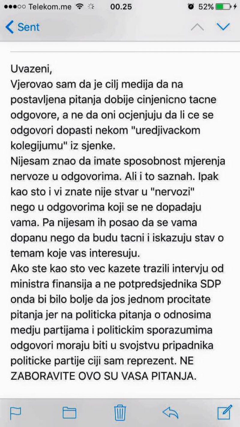 Objavljena je i prepiska novinarke Antene M i Konjevića u kojoj novinarka navodi da su odgovori Konjevića "nervozni", kao i e-mail u kojem se navodi da je tražen intervju od ministra finansija, "a ne od nervoznog potpredsjednika SDP".