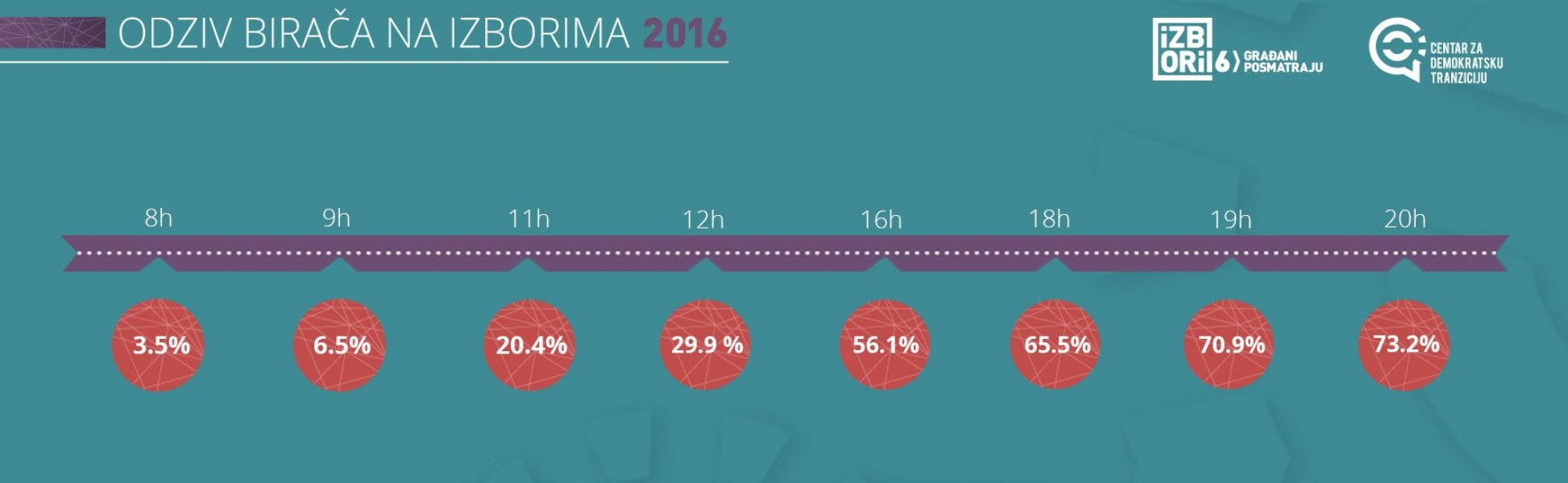 Prema podacima CEMI-ja do devet sati je glasalo 6.7 odsto glasača, što je više u odnosu na izbore 2009 i 2012 godine. Ukupna izlaznost 2012. je bila 70.3 odsto.