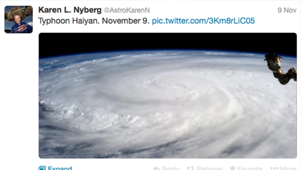 Karen je devetog novembra fotografisala tajfun iz svemira, a prije njenog povratka na Zemlju ove nedelje, fotografija je "retvitovana" na stotine puta.