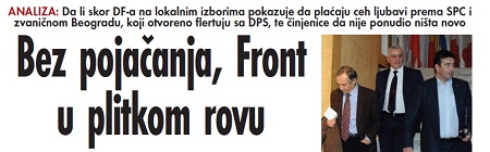 Takođe, ostali su nijemi na otvoren flert zvaničnog Beograda i dijela Srpske pravoslavne crkve u Crnoj Gori sa Demokratskom partijom socijalista (DPS) koja je, kako su to pokazali izbori u Mojkovcu, na Cetinju, ali i stranačke ankete, počela da ulazi u prosrpsko biračko tijelo koje je izgubilo opozicionu kondiciju.
