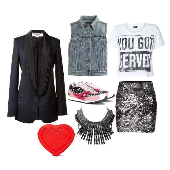 Party stil smo takođe jednostavno postigli tako što smo odjenuli kratku suknju posutu šljokicama, a u gornjem dijelu smo birali jednostavnu majicu zanimljivog natpisa na koju smo stavili i upečatljivu ogrlicu. Preko svega smo prebacili i jeans prsluk, a torbica u oblicu srca i crni smoking preko su učinili cijelu kombinaciju pažnje vrijednom.